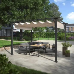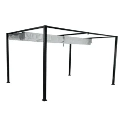 Der Clou: Im Lieferumfang des Pavillons ist zusätzlich ein Seitenrollo mit einer Breite von 265 cm enthalten, das sich kinderleicht montieren lässt. Der Rahmen des Seitenrollos besteht gleichermaßen aus witterungsbeständigem Aluminium in der Farbe Anthrazit. Das Gewebe selbst ist aus langlebigem Kunststoff gefertigt.
