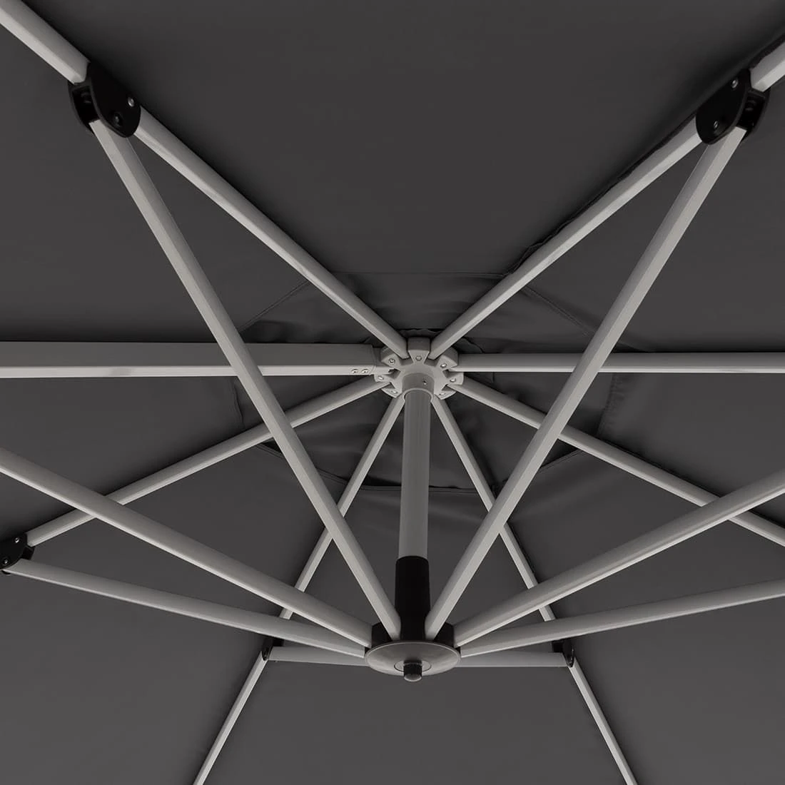 Der Dachbezug besteht aus Polyestergewebe. Der Schirmmast, sowie die Dachstreben sind aus Aluminium gefertigt. Der Sonnenschirm hat eine Durchgangshöhe von ca. 210 cm. Der Schirm lässt sich ganz bequem mittels einer Kurbel aufspannen und bietet mehrere schräg einstellbare Positionen. Bei diesem Sonnenschirm-Modell ist das Schirmdach sowohl aufstellbar als auch nach rechts/links neigbar. Ganz bequem per Fußpedal lässt sich der Ampelschirm so drehen, wie man ihn gerade braucht.