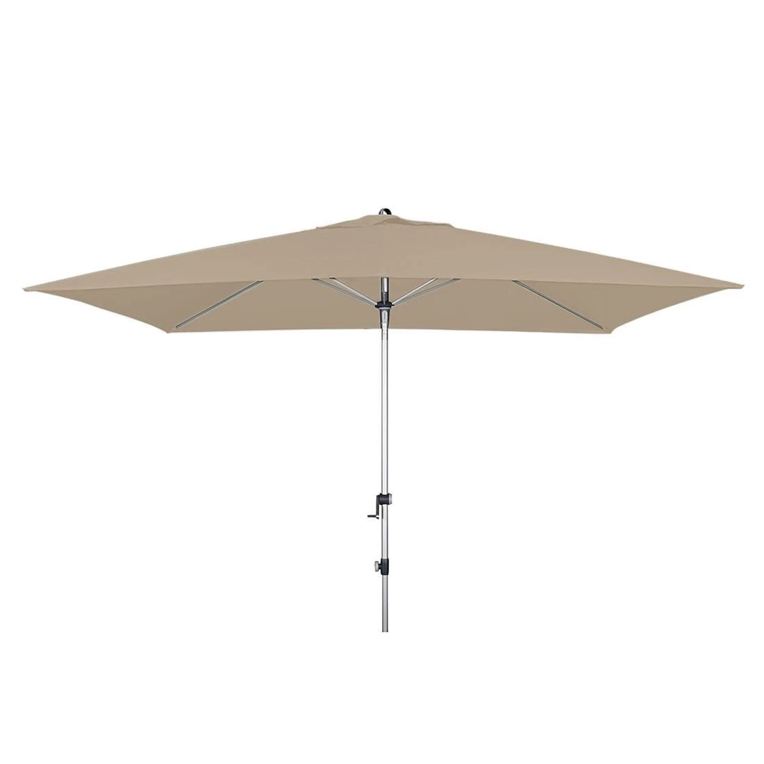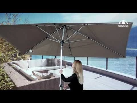 Das Schirmgestell besteht aus leichtem, aber dennoch sehr robustem Aluminium. Massive Streben halten das Schirmdach aus hochwertigem Polyester (UV 80). Der Bezugsstoff ist wasserabweisend, die Bedienung erfolgt mittels einer leichtgängigen Kurbel.