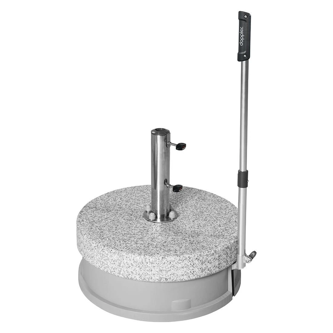 Mittels Liftfunktion des patentierten Fahrgestells kann der Schirmständer sehr leicht bewegt werden. Eine teleskopierbare Zugstange sorgt für weiteren Bediencomfort.