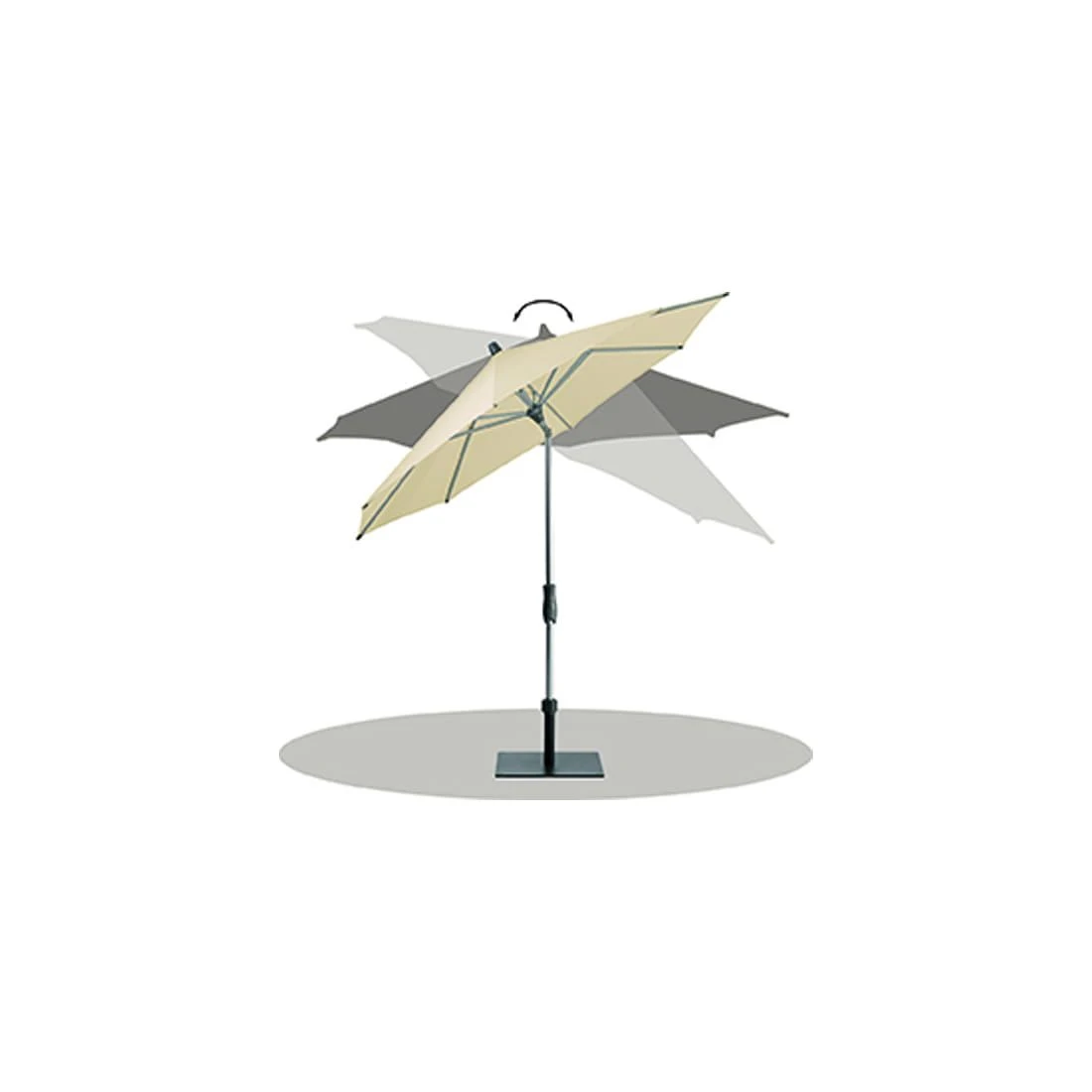 Material und Technik: Gestell und Streben sind aus Aluminium mit profiliertem Mast. Ein Kurbelantrieb sorgt für leichtes Öffnen des Schirms. Die Verstellung zur Neigung des Schirmdaches erfolgt mittels Drehrad oberhalb des Kurbelgehäuses. Der Schirmbezug ist auswechselbar und selbstspannend, dank den flexiblen Strebenenden.