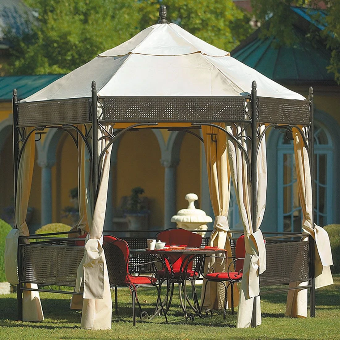 Witterungs- und UV-beständig, leicht zu reinigen, wasserabweisend, frostsicher (allerdings empfiehlt es sich, im Winter den Bezug abzunehmen und einzulagern).