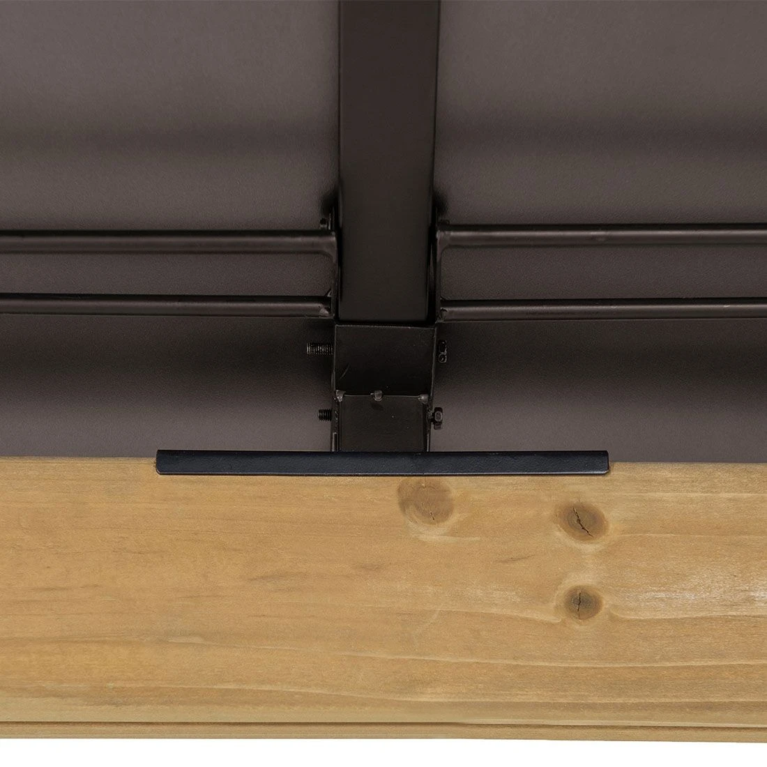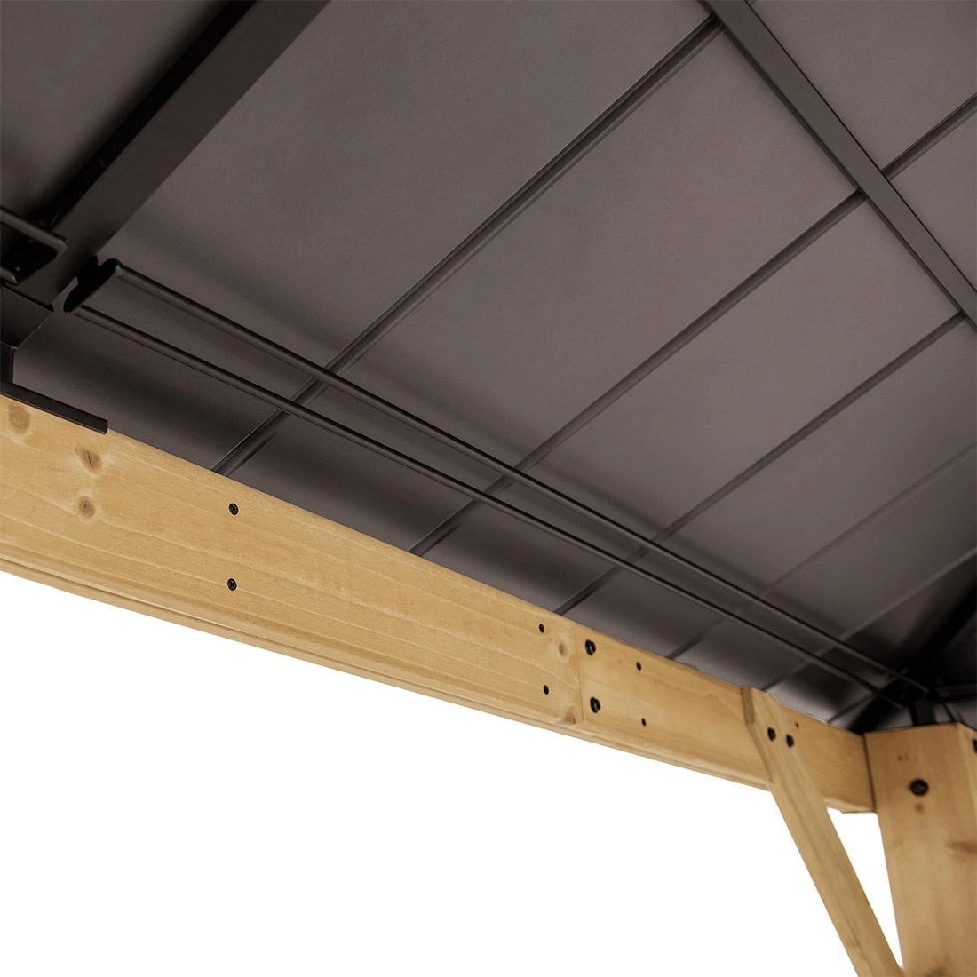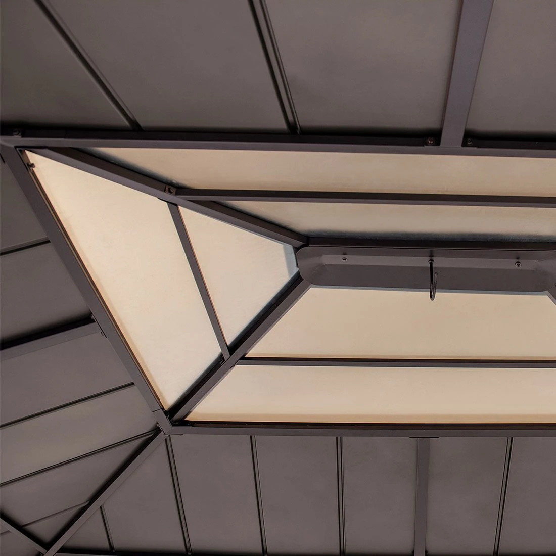 Gefertigt ist das stabile Grundgerüst aus massivem Zedernholz. Dieses Material ist überaus wetterbeständig und daher ideal, um im Outdoor-Bereich eingesetzt zu werden. Für die optimale Beschattung verfügt der OUTLIV. Pavillon über ein klassisches Walmdach aus rostfreiem Stahl und Polycarbonat. Damit Sie beim Sitzen optimale Lichtverhältnisse genießen können, ist oben ein elegantes Dachfenster für ein natürliches Oberlicht eingebaut.