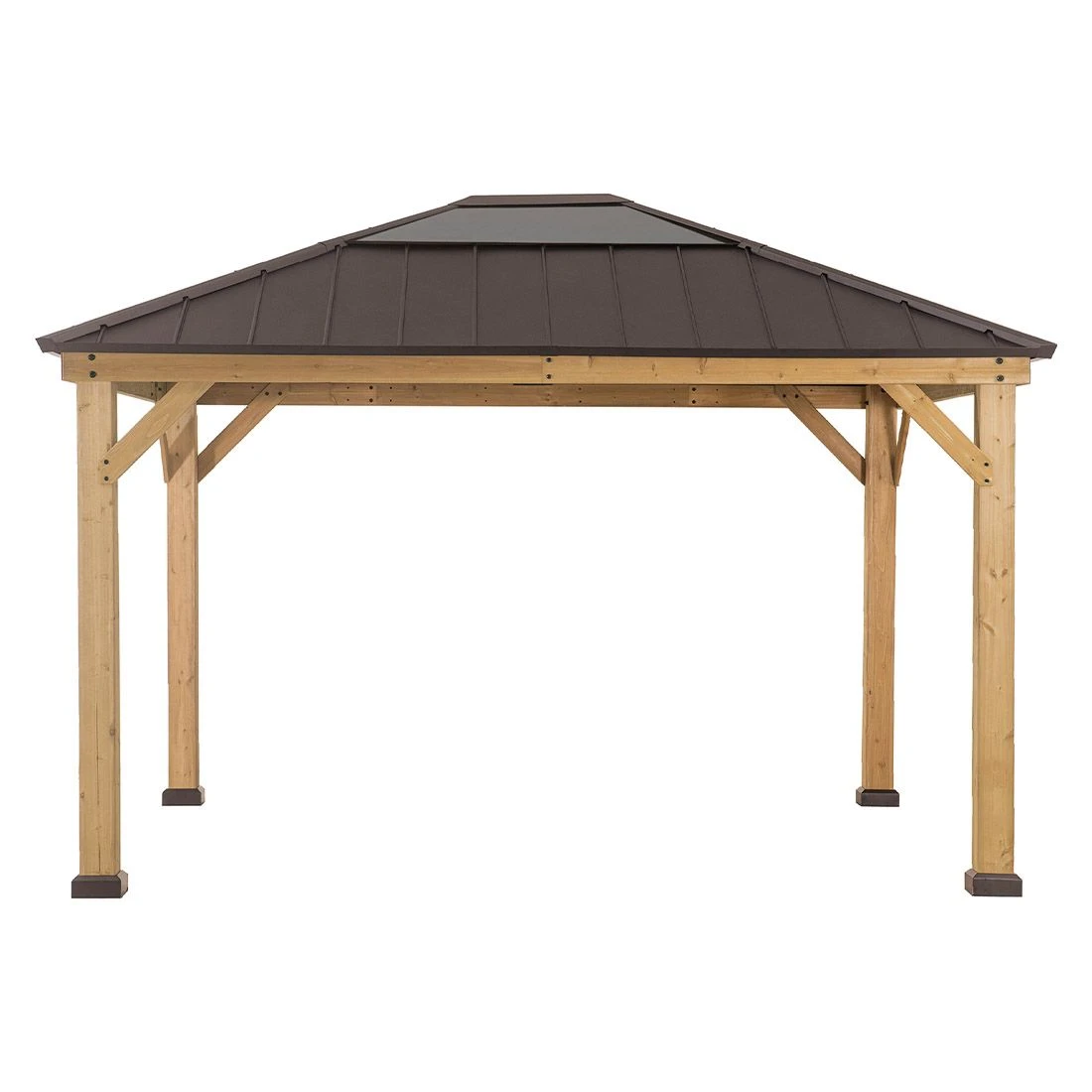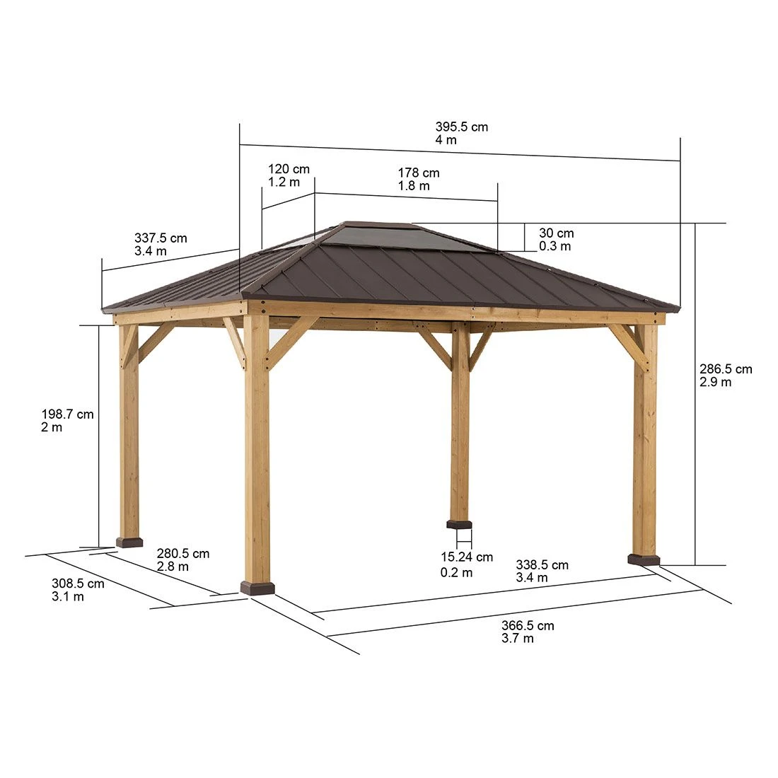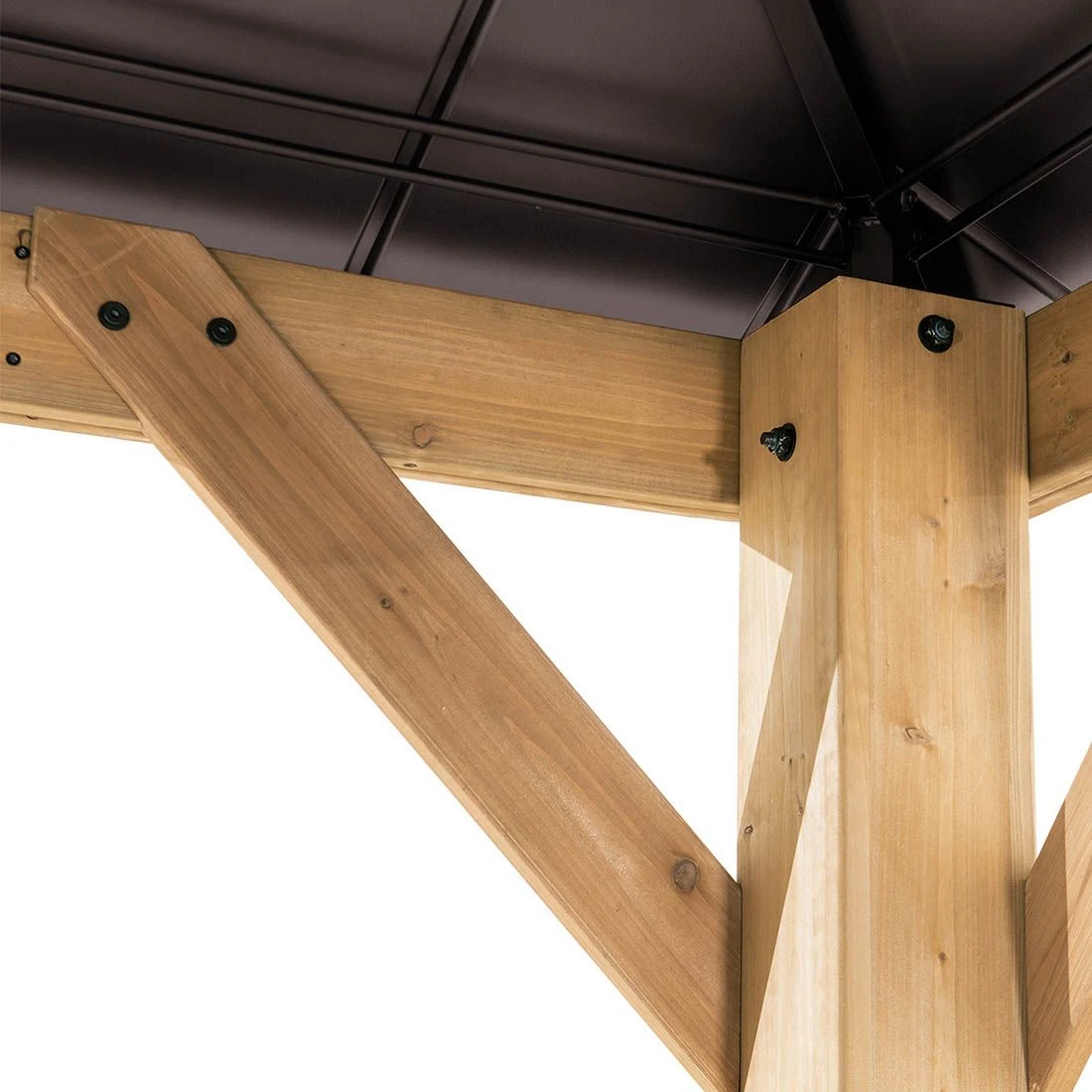 Gefertigt ist das stabile Grundgerüst aus massivem Zedernholz. Dieses Material ist überaus wetterbeständig und daher ideal, um im Outdoor-Bereich eingesetzt zu werden. Für die optimale Beschattung verfügt der OUTLIV. Pavillon über ein klassisches Walmdach aus rostfreiem Stahl und Polycarbonat. Damit Sie beim Sitzen optimale Lichtverhältnisse genießen können, ist oben ein elegantes Dachfenster für ein natürliches Oberlicht eingebaut.