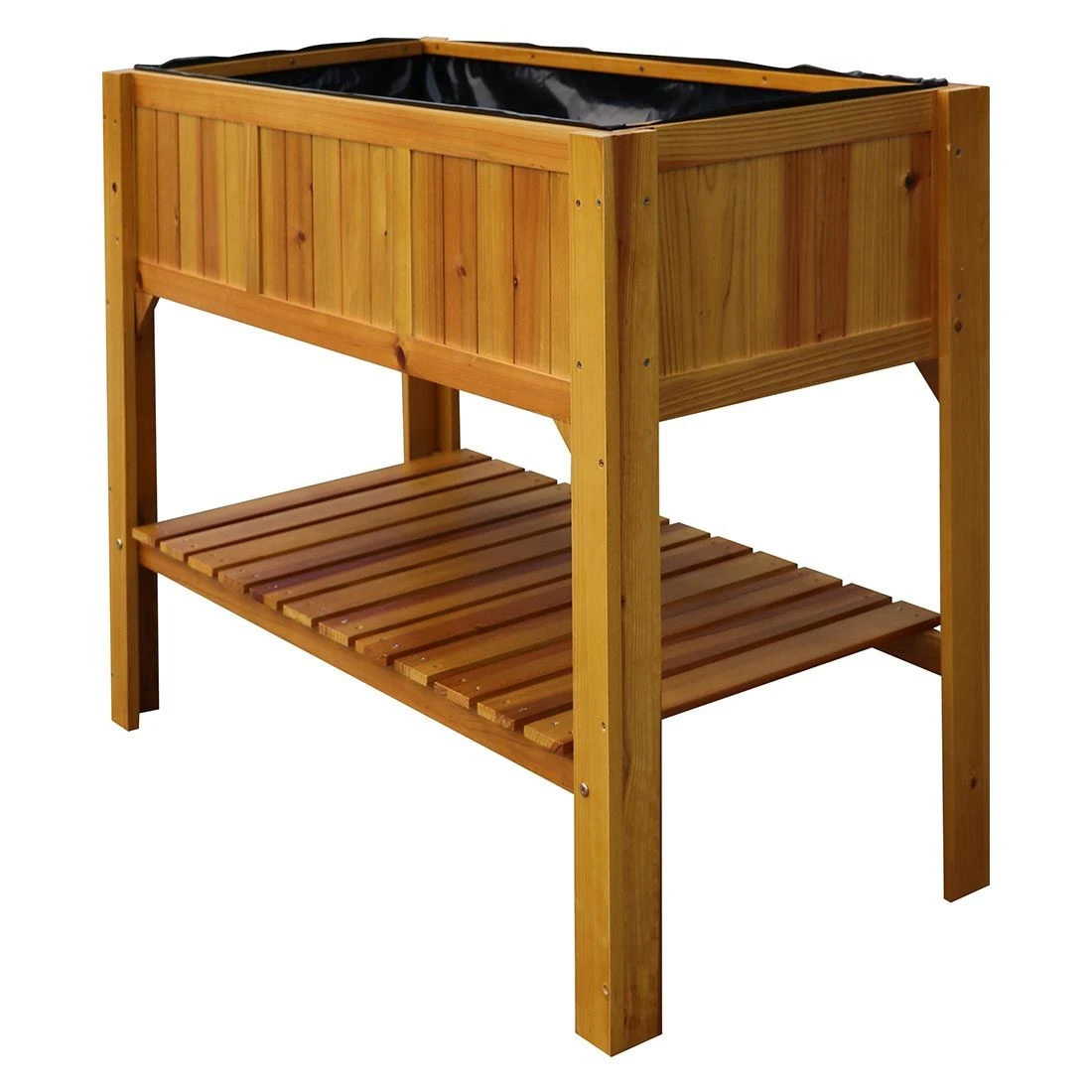 Das Grundgestell des Hochbeetes ist aus massivem Holz gefertigt und überaus langlebig. Der Pflanzbereich ist innen zudem mit einer stabilen Folie als Feuchtigkeitsschutz versehen. Unter dem Pflanztrog verfügt das Hochbeet über eine stabile Ablage, auf der Sie Ihre Schaufel, Dünger und Gießkanne für den nächsten Einsatz bereitstellen können.