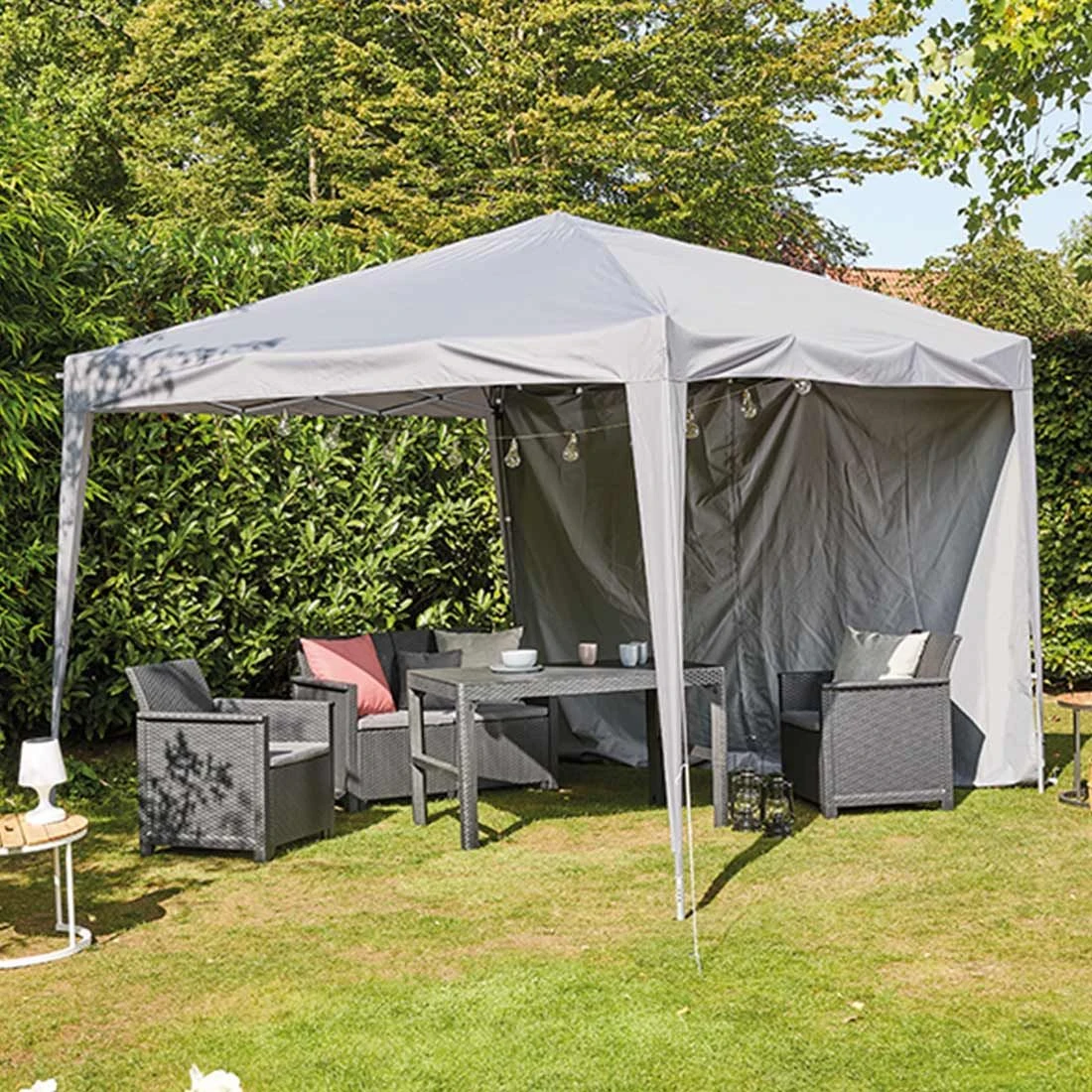 Im Lieferumfang des Faltpavillons sind neben dem Polyester-Dach und dem Faltgestell bereits vier geschlossene Seitenteile inklusive. So können Sie selbst entscheiden, wie viel Sichtschutz Sie anbringen möchten. Ob nur eine Seite oder alle vier – das bleibt Ihnen überlassen.